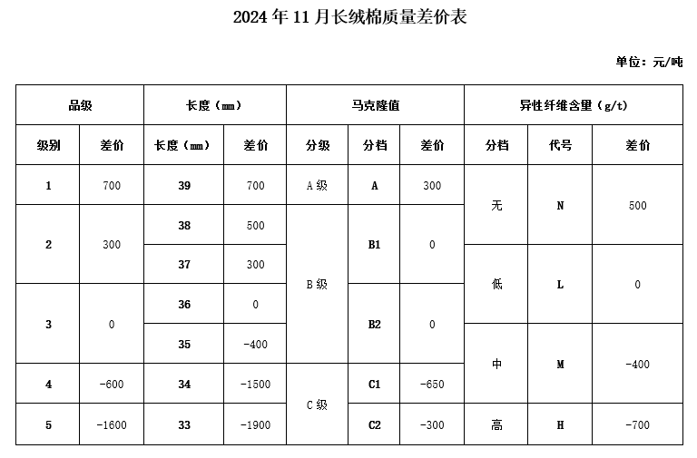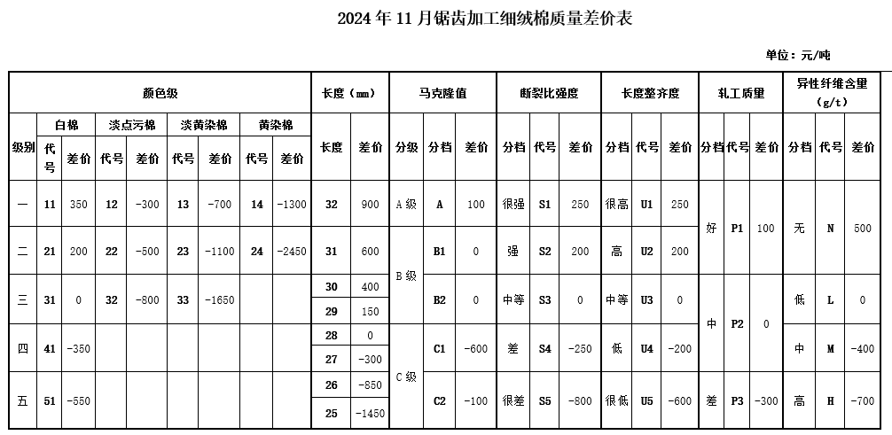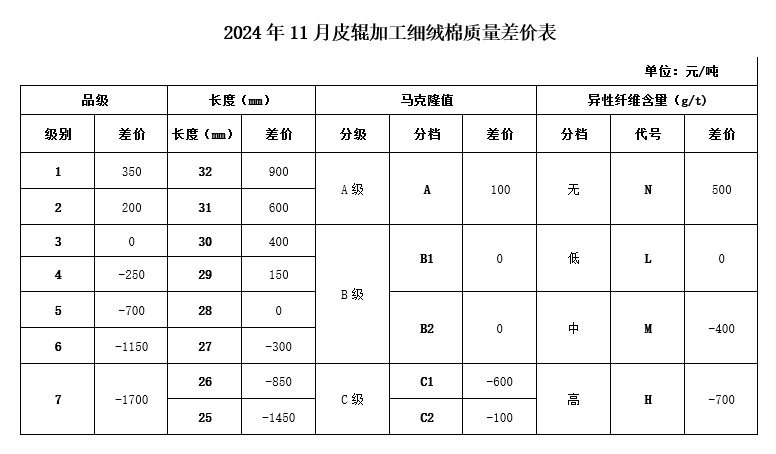 依據(jù)2024年10月的棉花公檢質(zhì)量數(shù)據(jù)、中國棉花協(xié)會(huì)棉花質(zhì)量價(jià)差自動(dòng)生成系統(tǒng)采集的棉花加工企業(yè)銷售成交價(jià)、紡織廠監(jiān)測點(diǎn)的采集數(shù)據(jù)、當(dāng)月的中國棉花價(jià)格指數(shù),并征求業(yè)內(nèi)相關(guān)專家的意見,現(xiàn)對(duì)2024年11月《中國棉花協(xié)會(huì)國產(chǎn)棉質(zhì)量差價(jià)表》做如下調(diào)整: