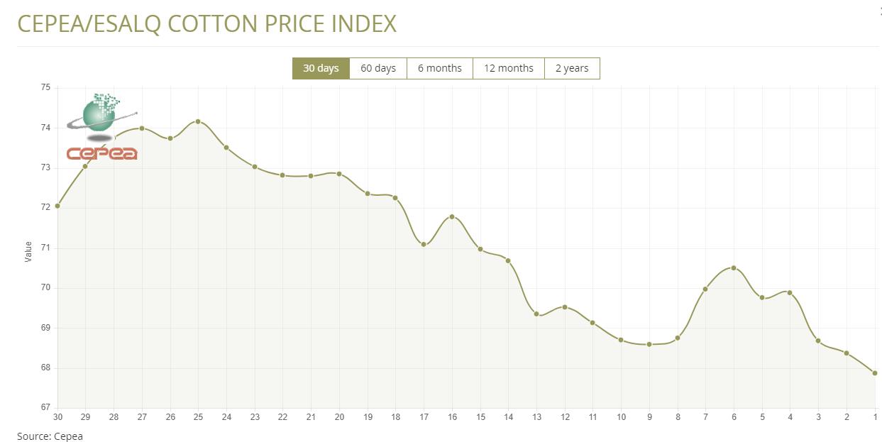 據(jù)外電10月31日消息,10月31日巴西CEPEA/ESALQ棉花價(jià)格指數(shù)報(bào)每磅67.87美分,較前一日下滑0.73%。