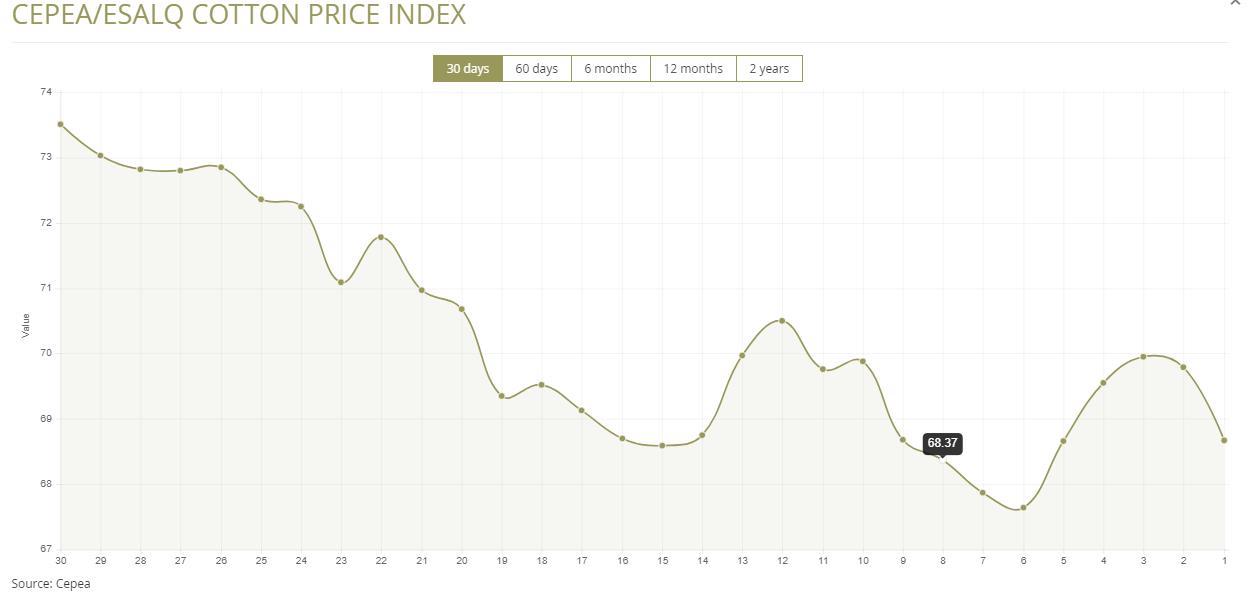 據(jù)外電11月8日消息,11月8日巴西CEPEA/ESALQ棉花價格指數(shù)報68.67美分/磅,較前一日下滑1.60%。