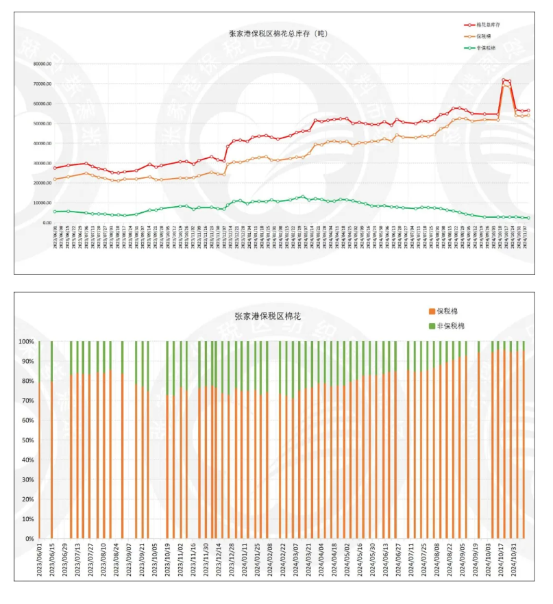 據(jù)張家港保稅區(qū)紡織原料市場統(tǒng)計,截至2024年11月11日,張家港保稅區(qū)棉花總庫存5.65萬噸,較上月同比增長0.60%;其中保稅棉5.41萬噸,較上月同比增長0.95%;非保稅棉0.24萬噸,較上月同比減少6.47%。從進口棉來源地來看,張家港保稅區(qū)棉花庫存中:美棉占比46.51%,較上月同比減少1.01百分點;巴西棉占比17.47%,較上月同比減少0.25百分點;其他國家及地區(qū)占比35.5%,較上月同比增長1.22百分點。當周進口棉進出入庫動態(tài)變化情況,張家港保稅區(qū)棉花庫存中,出庫1761.22噸,入庫1903.08噸,凈入庫(141.86)噸。