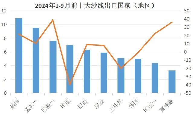 越南:1-9月我國(guó)對(duì)越南出口紗線(xiàn)10.9億美元,同比增長(zhǎng)21.3%。9月我國(guó)對(duì)越南出口紗線(xiàn)1.2億美元,同比增長(zhǎng)17.4%。
