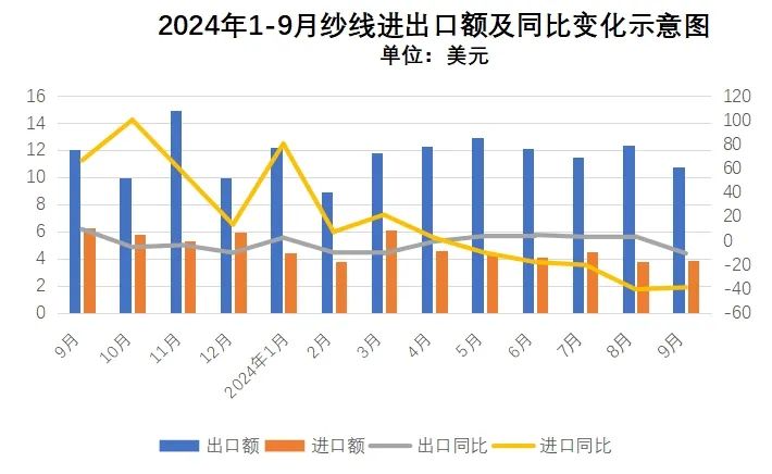 從進(jìn)口情看,我國(guó)中間品進(jìn)口大幅增長(zhǎng),1-9月紗線(xiàn)面料進(jìn)口59.2億美元,同比下降7.5%。從具體產(chǎn)品看,紗線(xiàn)進(jìn)口39.4億美元,同比下降9.5%,面料進(jìn)口19.8億美元,同比下降3.1%。