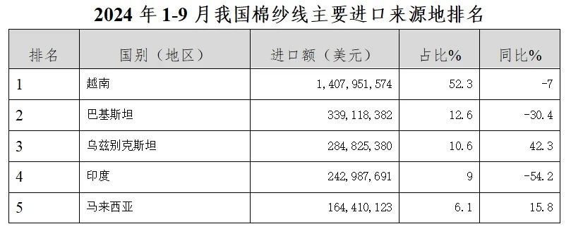 從大類(lèi)產(chǎn)品看,2024年1-9月進(jìn)口棉紗線(xiàn)26.9億美元,同比下降15%,進(jìn)口數(shù)量112萬(wàn)噸,同比下降7.3%;進(jìn)口化纖10.8億美元,同比上漲4.8%;進(jìn)口絲線(xiàn)和羊毛、動(dòng)物紗線(xiàn)215.2萬(wàn)美元、1.0億美元,同比增長(zhǎng)31%、12.9%。我國(guó)紗線(xiàn)進(jìn)口以棉紗線(xiàn)為主,占紗線(xiàn)進(jìn)口總額的70%。