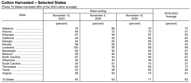 據(jù)外電11月12日消息,美國農(nóng)業(yè)部(USDA)在每周作物生長報告中公布稱,截至2024年11月10日當(dāng)周,美棉收割率為71%,前周為63%,去年同期為64%,五年均值為63%。