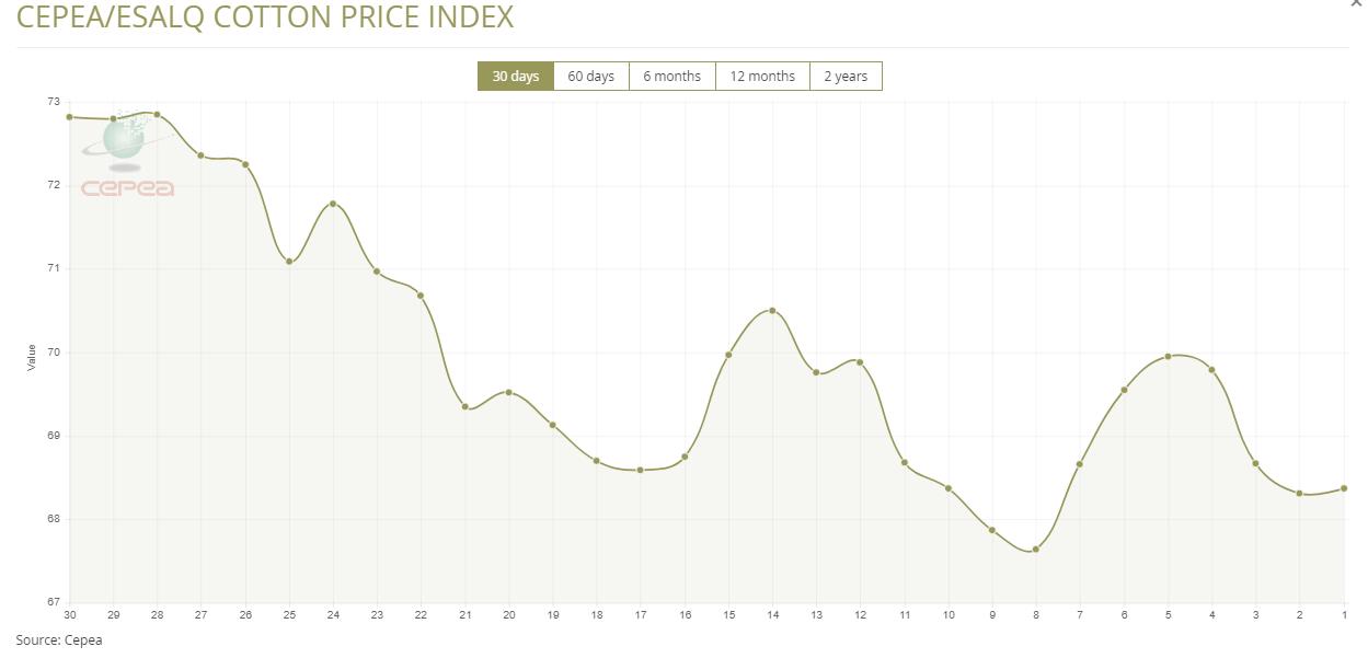 據(jù)外電11月12日消息,11月12日巴西CEPEA/ESALQ棉花價(jià)格指數(shù)報(bào)68.37美分/磅,較前一日上漲0.09%。