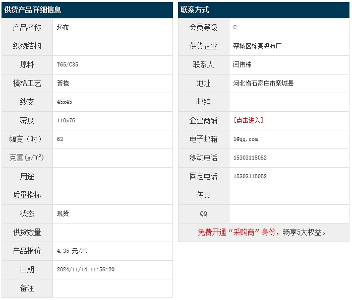 11月14日,欒城區(qū)棟亮織布廠滌棉布T65/C35 45x45 110x76 63",報(bào)價(jià)為4.35元/米,實(shí)際成交價(jià)以協(xié)商為準(zhǔn)。[點(diǎn)擊查看詳情]