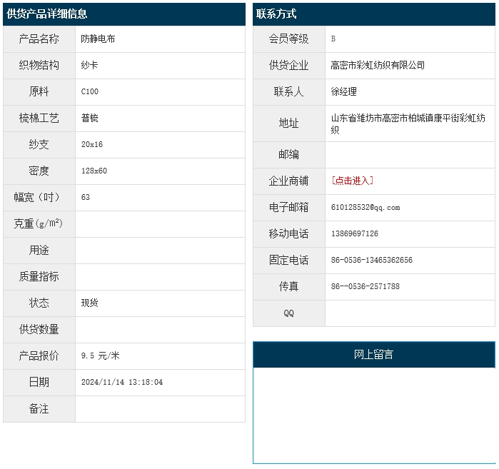 11月14日,高密彩虹紡織有限公司防靜電紗卡C100 20x16 128x60 63",報價為9.5元/米,實際成交價以協(xié)商為準。[點擊查看詳情]