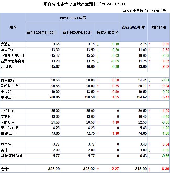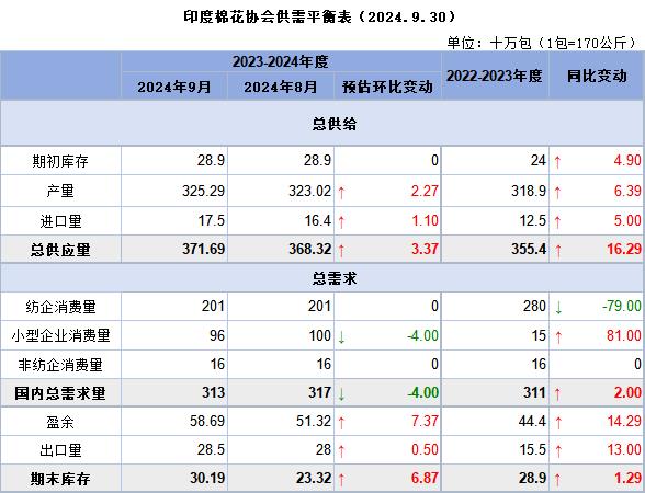 印度棉花協(xié)會(CAI)將2023/24年度印度棉花產(chǎn)量預(yù)估從3230.2萬包上調(diào)至3252.9萬包,上調(diào)幅度為22.7萬包,同時也高于2022/23年度的3189萬包;國內(nèi)總需求預(yù)估從3170萬包下調(diào)至3130萬包;期末庫存預(yù)估從233.2萬包上調(diào)至301.9萬包;出口量預(yù)估從280萬包上調(diào)至285萬包。