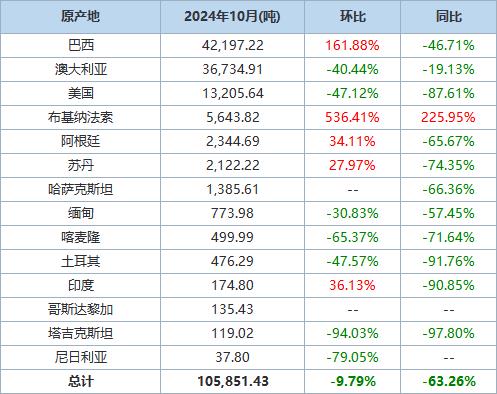 據(jù)海關(guān)統(tǒng)計(jì)數(shù)據(jù),2024年10月我國(guó)進(jìn)口棉花約11萬(wàn)噸,環(huán)比減少約1萬(wàn)噸,同比下降約63.3%。