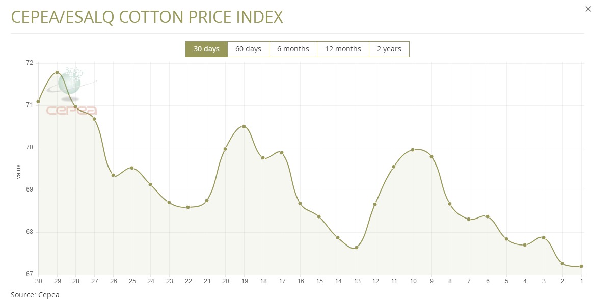 據(jù)外電11月21日消息,11月21日巴西CEPEA/ESALQ棉花價(jià)格指數(shù)報(bào)67.19美分/磅,較前一日下跌0.10%。