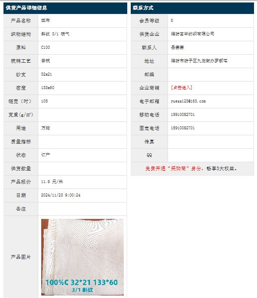 11月23日,濰坊富華紡織有限公司純棉斜紋C100 32x21 133x60 105" 3/1 噴氣,報價為11.8元/米,實際成交價以協(xié)商為準(zhǔn)。[點擊查看詳情]