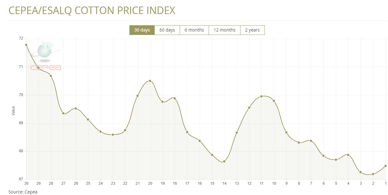 據(jù)外電11月22日消息,11月22日巴西CEPEA/ESALQ棉花價(jià)格指數(shù)報(bào)67.48美分/磅,較前一日上漲0.43%。