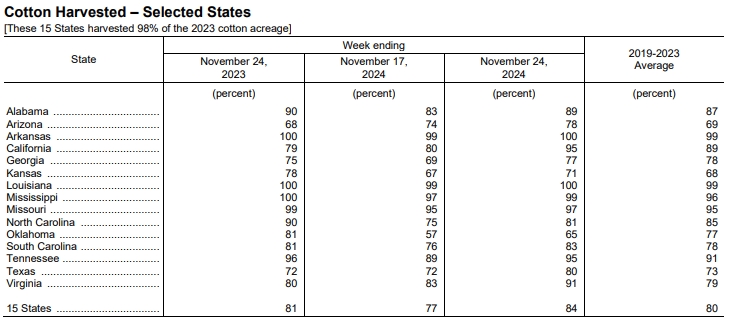 據(jù)外電11月25日消息,美國(guó)農(nóng)業(yè)部(USDA)在每周作物生長(zhǎng)報(bào)告中公布稱(chēng),截至2024年11月24日當(dāng)周,美棉收割率為84%,前周為77%,去年同期為81%,五年均值為80%。