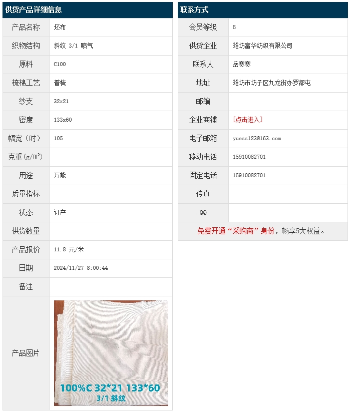 11月27日,濰坊富華紡織有限公司純棉斜紋C100 32x21 133x60 105" 3/1 噴氣,報(bào)價(jià)為11.8元/米,實(shí)際成交價(jià)以協(xié)商為準(zhǔn)。[點(diǎn)擊查看詳情]