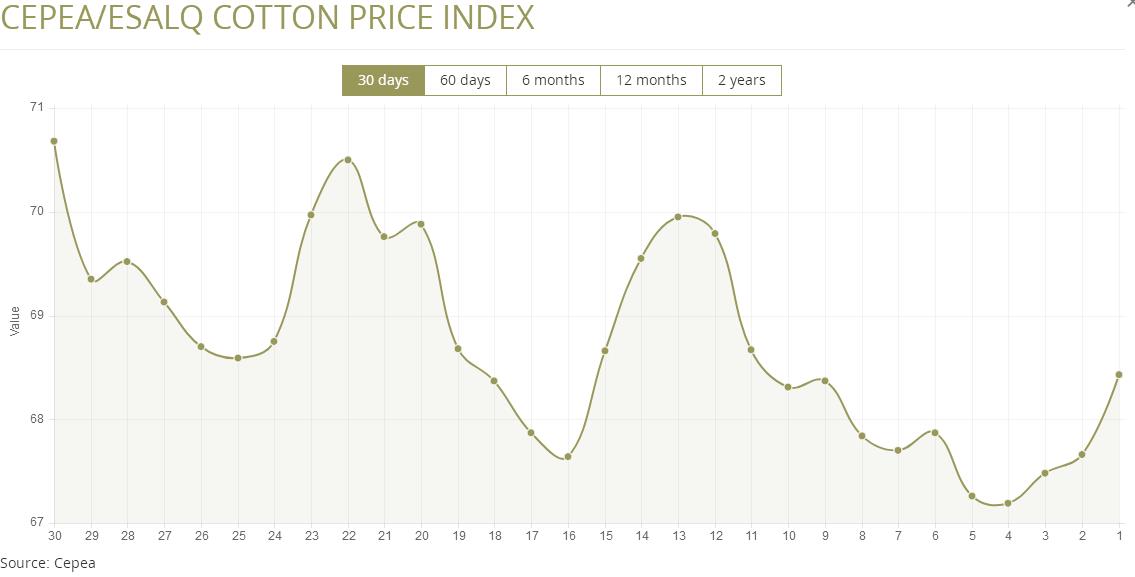 據(jù)外電11月25日消息,11月26日巴西CEPEA/ESALQ棉花價格指數(shù)報68.43美分/磅,較前一日上漲1.14%。