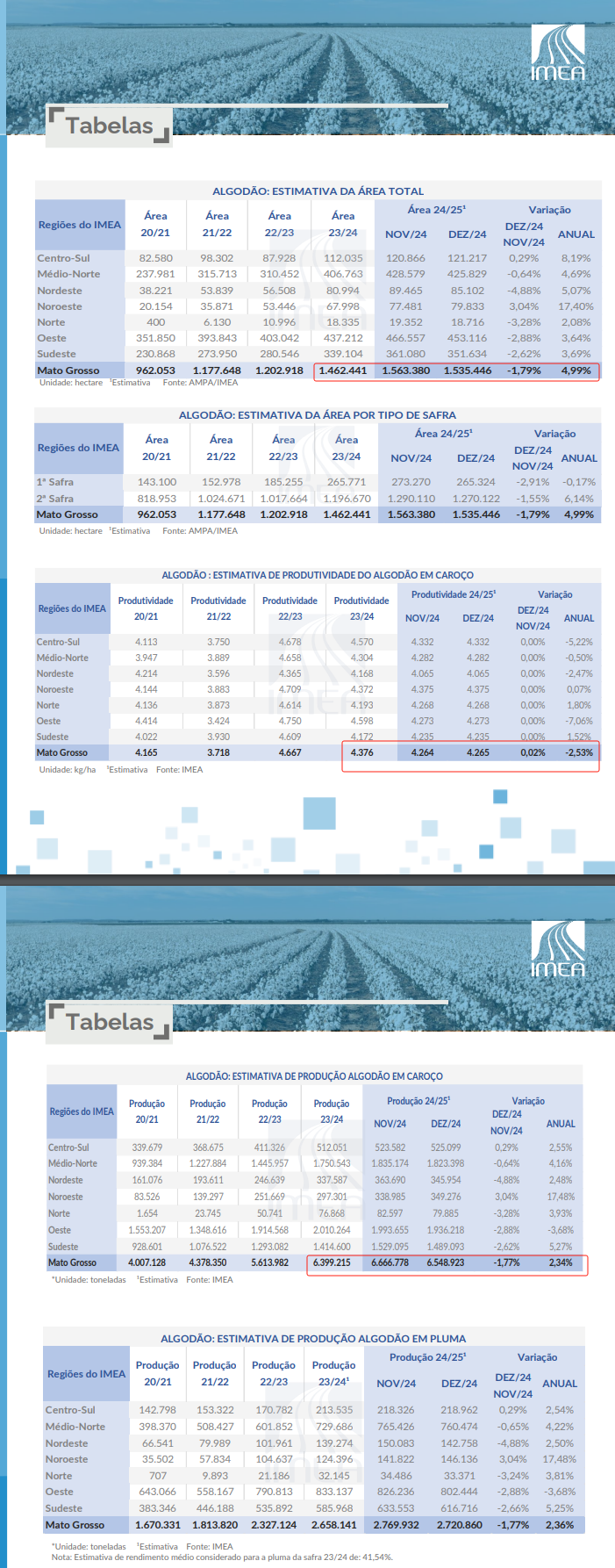 巴西馬托格羅索州農(nóng)業(yè)經(jīng)濟(jì)廳(IMEA)公布的月報顯示,該州2024/25年度棉花種植面積預(yù)期為153.54萬公頃,較上月預(yù)期的156.34萬公頃減少1.79%,較2023/24年度的146.24萬公頃增加4.99%;單產(chǎn)預(yù)期為4265千克/公頃,較上月預(yù)期的4264千克/公頃增加0.02%,較2023/24年度的4376千克/公頃減少2.53%;產(chǎn)量預(yù)期為654.89萬噸,較上月預(yù)期的666.68萬噸減少1.77%,較2023/24年度的639.92萬噸增加2.34%。