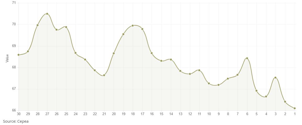據(jù)外電12月3日消息,12月3日巴西CEPEA/ESALQ棉花價格指數(shù)報66.10美分/磅,較前一日下跌0.47%。