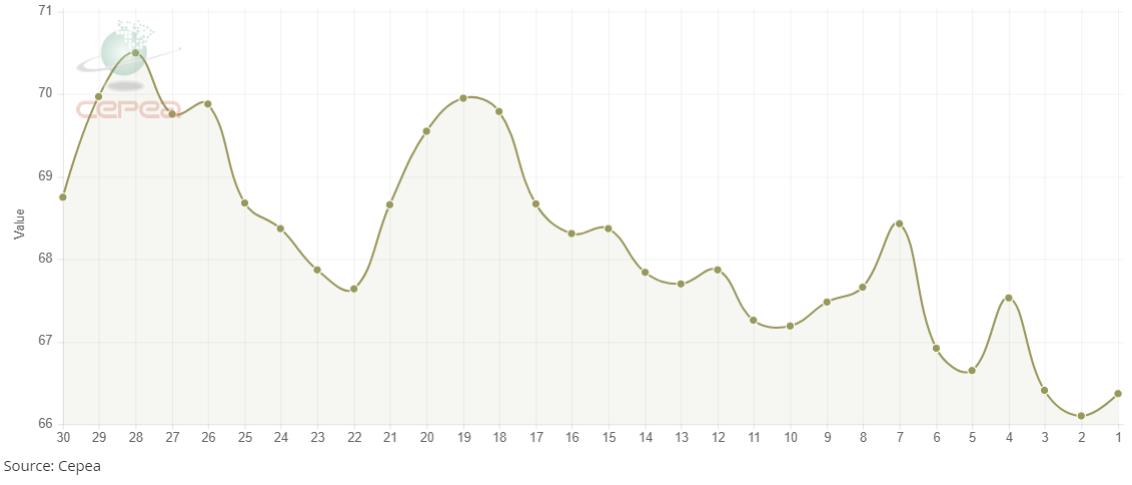 據(jù)外電12月4日消息,12月4日巴西CEPEA/ESALQ棉花價格指數(shù)報66.37美分/磅,較前一日上漲0.41%。