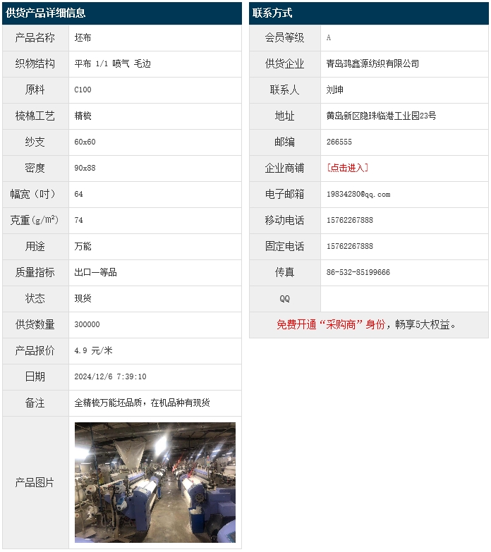 12月6日,青島鴻鑫源紡織有限公司純棉平布JC100 60x60 90x88 64" 1/1 74g/㎡ 噴氣 毛邊,報(bào)價(jià)為4.9元/米,實(shí)際成交價(jià)以協(xié)商為準(zhǔn)。[點(diǎn)擊查看詳情]