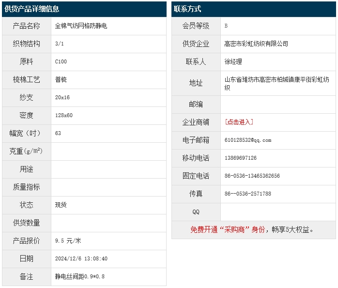 12月6日,高密彩虹紡織有限公司純棉網(wǎng)格防靜電C100 20x16 128x60 63" 3/1 靜電絲間距0.9*0.8,報(bào)價(jià)為9.5元/米,實(shí)際成交價(jià)以協(xié)商為準(zhǔn)。[點(diǎn)擊查看詳情]