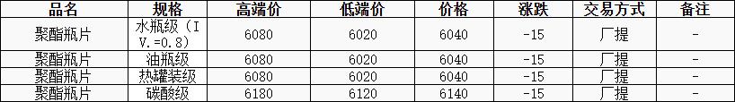 華東聚酯瓶片價(jià)格下跌15元至6040元/噸,原油及原料窄幅下行,聚酯瓶片工廠報(bào)價(jià)下調(diào)50元/噸,12月貨源實(shí)單6000元/噸。市場(chǎng)重心略有下滑,12月貨源報(bào)盤(pán)期貨合約03貼水30或報(bào)盤(pán)6020-6080,局部略高6300;遞盤(pán)6000-6020;1月貨源報(bào)盤(pán)6050附近,遞盤(pán)6000-6020;業(yè)內(nèi)觀望情緒濃厚,終端某大廠招標(biāo)遠(yuǎn)月貨源。