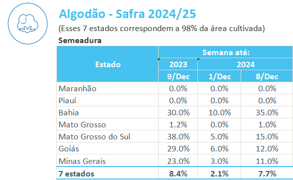 據(jù)巴西農(nóng)業(yè)部下屬的國家商品供應(yīng)公司CONAB,截至12月8日,巴西棉花播種率為7.7%,上周為2.1%,去年同期為8.4%。
