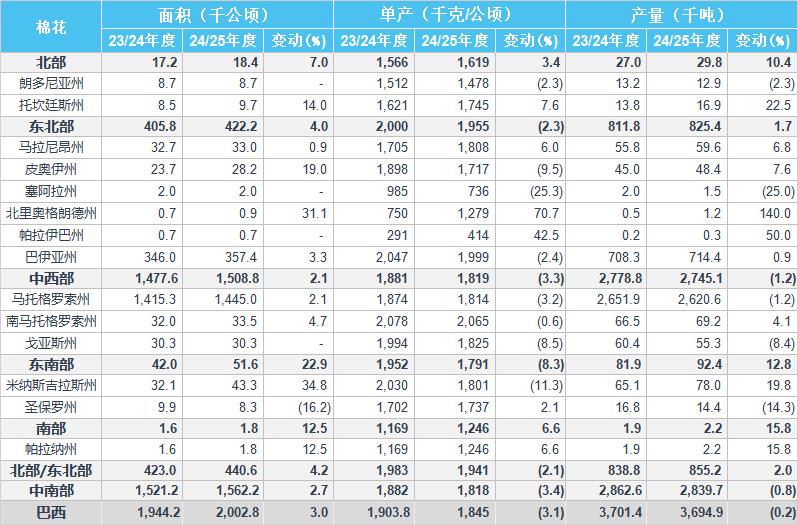 2024/25年度巴西棉花種植面積預(yù)估為200.28萬公頃,同比增加3%,2023/24年度為194.42萬公頃。