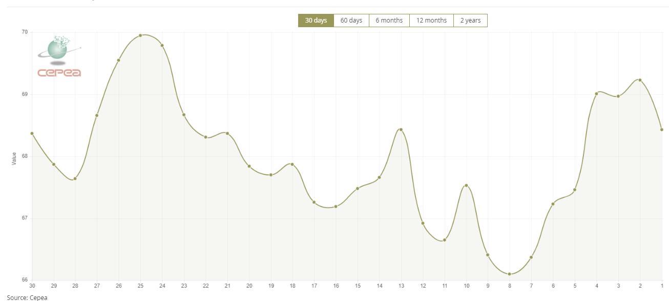 據(jù)外電12月12日消息,12月12日巴西CEPEA/ESALQ棉花價格指數(shù)報68.43美分/磅,較前一日下跌1.16%。