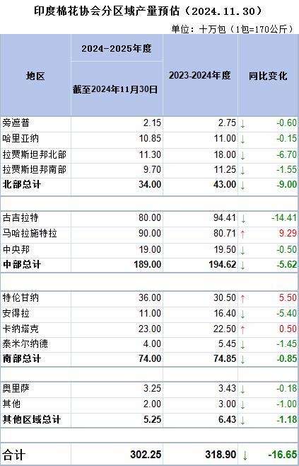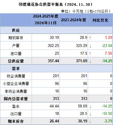 據(jù)外電12月18日消息,印度棉花協(xié)會(huì)(CAI)發(fā)布2024/25年度印度棉花供需首份預(yù)估,產(chǎn)量預(yù)估為3022.5萬包,出口預(yù)估為180萬包。期末庫存預(yù)估為264.4萬包,較上年度下滑37.5萬包。