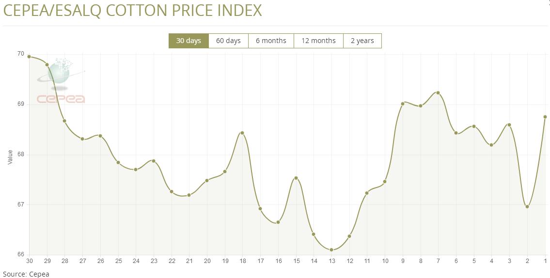 據(jù)外電12月19日消息,12月19日巴西CEPEA/ESALQ棉花價(jià)格指數(shù)報(bào)68.75美分/磅,較前一日下跌2.67%。