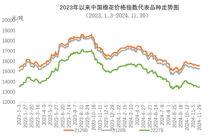 11月,棉紡織淡季特征顯現(xiàn),下游訂單整體轉弱。當月棉花上市量大增,市場供應持續(xù)寬松,中國棉花價格指數(shù)(CCIndex3128B)震蕩下跌,中上旬在15300元/噸之上波動,最高至15406元/噸,下旬震蕩回落,最低至15249元/噸,月末略有回升。中國棉花價格指數(shù)(CCIndex3128B)月均價15327元/噸,環(huán)比下跌201元,同比下跌1499元。