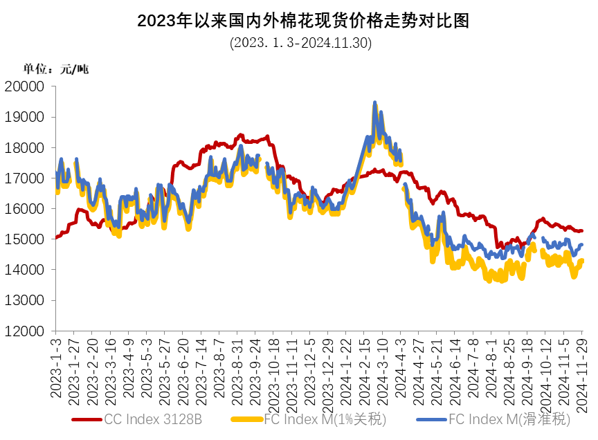 11月,國內新棉上市量大幅增加,供應端壓力持續(xù),棉紡織行業(yè)進入傳統(tǒng)淡季,下游訂單整體走弱,成品庫存累積上升,部分企業(yè)為減少壓力降價銷售,皮棉采購較為謹慎,國內現(xiàn)貨價格震蕩走低。同期,受美國大選結果、美聯(lián)儲降息預期反復、美棉裝運數(shù)據(jù)創(chuàng)年度新高等因素影響,國際棉價先跌后漲,走勢強于國內,內外棉價差有所收窄。