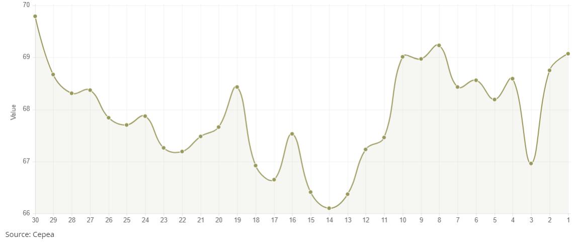 據(jù)外電12月20日消息,12月20日巴西CEPEA/ESALQ棉花價(jià)格指數(shù)報(bào)69.07美分/磅,較前一日上漲0.47%。