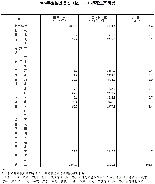 根據(jù)對(duì)全國31個(gè)省(區(qū)、市)的統(tǒng)計(jì)調(diào)查(新疆棉花播種面積通過遙感測量取得),2024年全國棉花播種面積、單位面積產(chǎn)量和總產(chǎn)量分別如下: