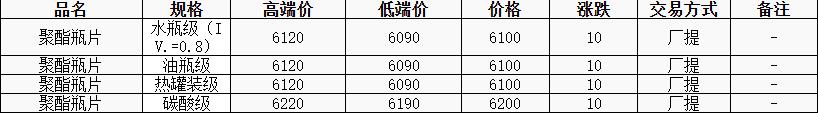 華東聚酯瓶片價格上漲10元至6100元/噸,原油上漲,成本表現(xiàn)堅挺。聚酯瓶片工廠依然持穩(wěn),1月實單6150-6200元/噸;市場重心略有上揚,場內(nèi)低價貨源消失,12-1月貨源報盤6090-6120元/噸,局部6160元/噸;剛需零星遞盤6090-6100元/噸;2月貨源報盤6150-6180元/噸,交投清淡。