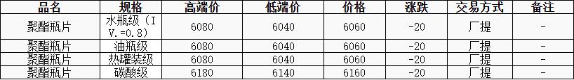 華東聚酯瓶片價(jià)格下跌20元至6060元/噸,原油及原料拖累,聚酯瓶片工廠部分持穩(wěn),部分下調(diào)50元/噸,1月實(shí)單6080元/噸左右。市場重心延續(xù)跌勢,1月貨源報(bào)盤6040-6080元/噸或期貨合約03貼水70元/噸;遞盤6030-6050元/噸;2月貨源報(bào)盤6080-6100元/噸,臨近年底,下游買氣偏弱,商談清淡。