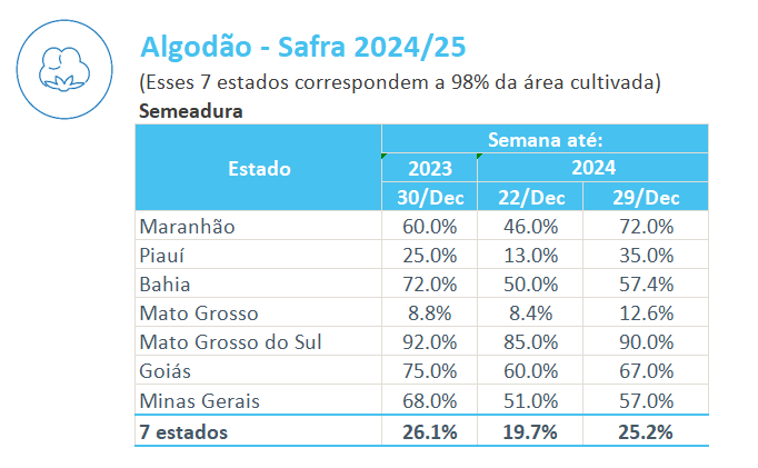 據(jù)巴西農(nóng)業(yè)部下屬的國家商品供應(yīng)公司CONAB,截至12月29日,巴西棉花播種率為25.2%,上周為19.7%,去年同期為26.1%。