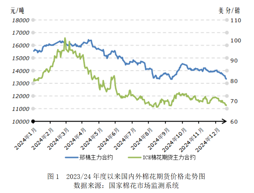 12月,美聯(lián)儲降息25個基點,但暗示未來將放緩步伐,美元指數(shù)觸及2年最高,美股及大宗商品市場普遍下跌;北半球棉花集中供應,南半球新棉播種順利,供應端壓力延續(xù)。國內(nèi)消費潛力仍待釋放,內(nèi)需短暫回溫后再現(xiàn)疲態(tài),年末紡織廠補庫潮落空,市場信心下滑,國內(nèi)外棉價均呈跌勢。截至12月30日,ICE棉花期貨主力合約結算價68.48美分/磅,較上月末下跌3.45美分/磅,跌幅4.80%;代表進口棉中國主港到岸均價的國際棉花指數(shù)(M)78.30美分/磅,較上月末下跌1.96美分/磅,折人民幣進口成本13670元/噸(1%關稅,不含港雜費),較上月末下跌198元/噸,跌幅1.43%。鄭州商品交易所棉花期貨主力合約結算價13430元/噸,較上月末下跌580元/噸,跌幅4.14%;代表內(nèi)地標準級皮棉市場價格的國家棉花價格B指數(shù)14639元/噸,較上月末下跌642元/噸,跌幅4.20%。