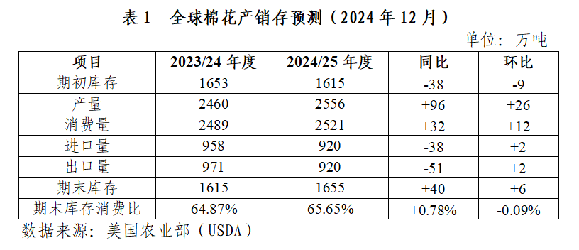 據(jù)美國農(nóng)業(yè)部12月預測,2024/25年度全球棉花產(chǎn)量2556萬噸,同比增加96萬噸,環(huán)比調(diào)增26萬噸;全球棉花消費量2521萬噸,同比增加32萬噸,環(huán)比調(diào)增12萬噸;產(chǎn)大于需35萬噸,扭轉(zhuǎn)上年度產(chǎn)不足需局面,環(huán)比擴大14萬噸;全球棉花庫存消費比為65.65%,較上年度上升0.78個百分點。