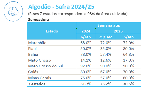 據(jù)巴西農(nóng)業(yè)部下屬的國(guó)家商品供應(yīng)公司CONAB,截至1月5日,巴西棉花播種率為30.5%,上周為25.2%,去年同期為31.7%。