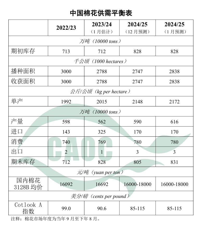 2024/25年度棉花生產(chǎn)預(yù)測(cè)數(shù)據(jù)根據(jù)國(guó)家統(tǒng)計(jì)局公告進(jìn)行調(diào)整,棉花播種面積調(diào)至2838.3千公頃,比上年增1.8%;單位面積產(chǎn)量調(diào)至每公頃2171.6公斤,比上年增7.8%;總產(chǎn)量調(diào)至616.4萬(wàn)噸,比上年增9.7%。本月進(jìn)口量和消費(fèi)量預(yù)測(cè)數(shù)據(jù)維持上月不變,期末庫(kù)存調(diào)增至831萬(wàn)噸。春節(jié)前紡織廠剛需補(bǔ)庫(kù),皮棉加工銷(xiāo)售進(jìn)度較快,據(jù)國(guó)家棉花市場(chǎng)監(jiān)測(cè)系統(tǒng)數(shù)據(jù),截至1月2日,全國(guó)皮棉加工率為94.4%,同比下降0.4個(gè)百分點(diǎn),銷(xiāo)售率為27.7%,同比提高7.9個(gè)百分點(diǎn)。