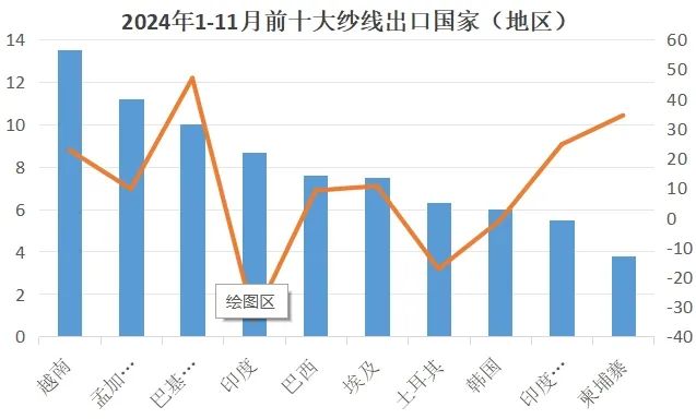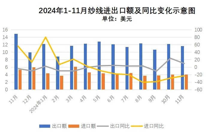 越南:1-11月我國對越南出口紗線13.5億美元,同比增長22.8%。11月我國對越南出口紗線1.3億美元,同比增長30.1%。