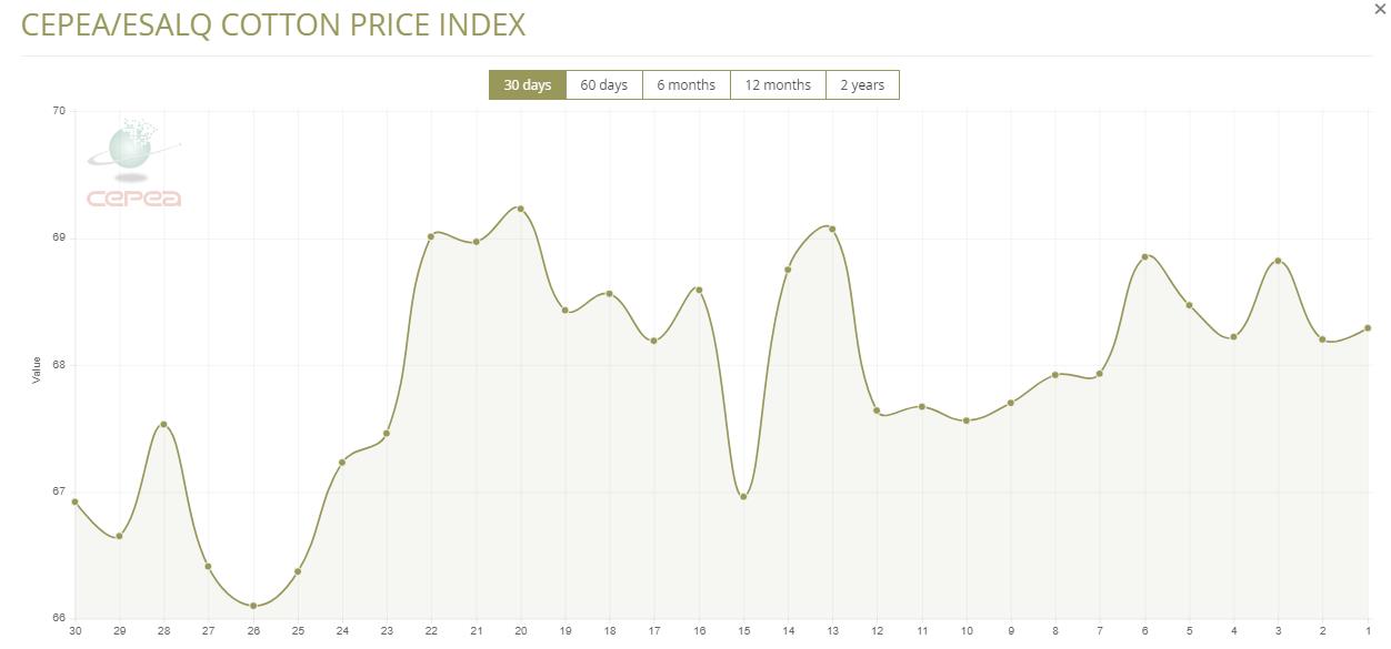 據(jù)外電1月13日消息,1月13日巴西CEPEA/ESALQ棉花價(jià)格指數(shù)報(bào)68.29美分/磅,較前一交易日上漲0.13%。