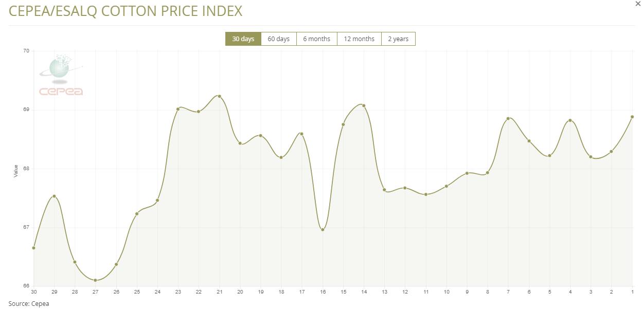 據(jù)外電1月14日消息,1月14日巴西CEPEA/ESALQ棉花價格指數(shù)報68.88美分/磅,較前一交易日上漲0.86%。