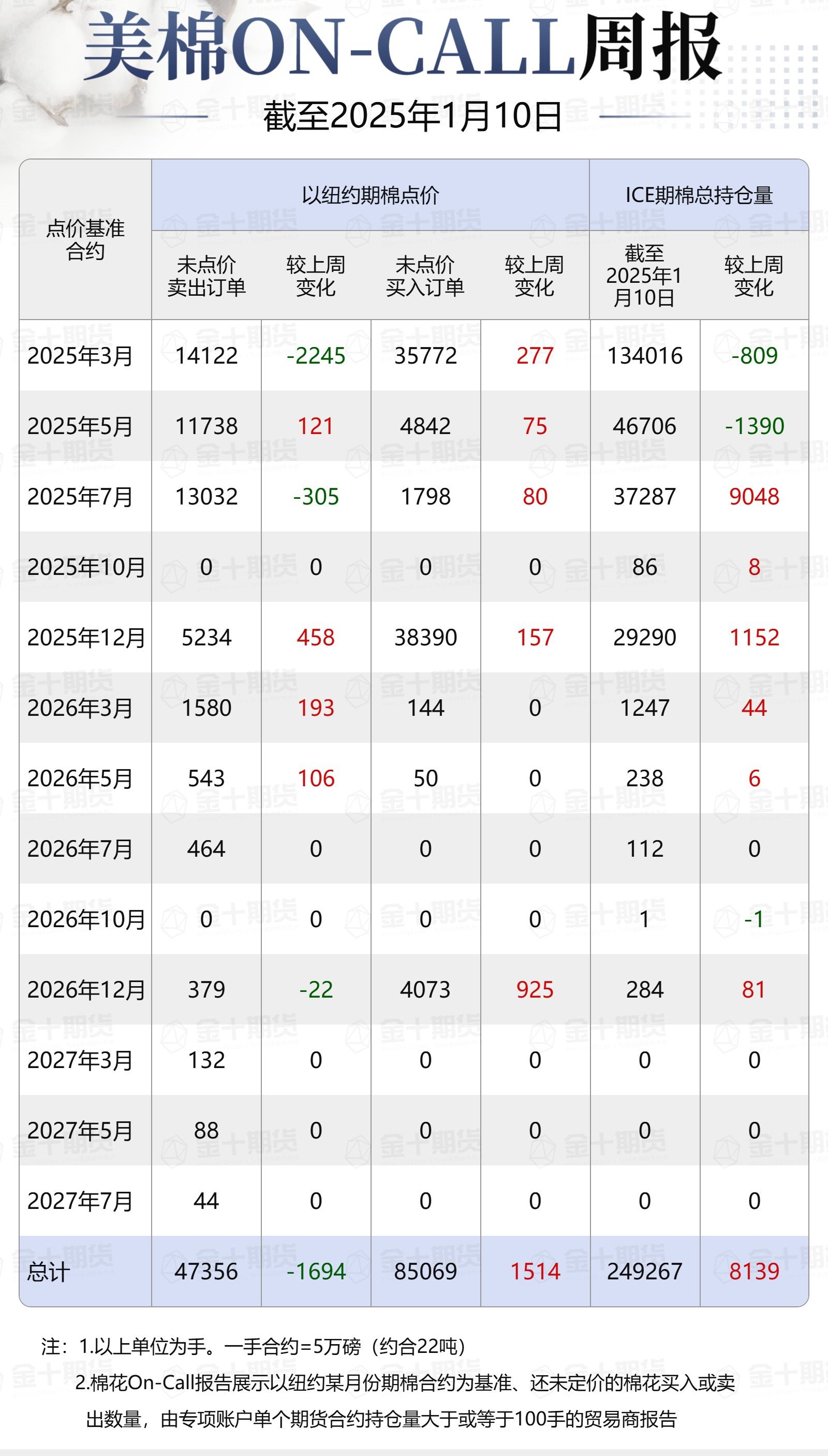 據(jù)美國(guó)商品期貨交易委員會(huì)(CFTC)最新數(shù)據(jù),截至1月10日,①美棉On-Call未點(diǎn)價(jià)賣出訂單47356手,環(huán)比減少1694手;未點(diǎn)價(jià)買入訂單85069手,環(huán)比增加1514手;②ICE期棉2503合約上賣方未點(diǎn)價(jià)合約為14122手,環(huán)比減少2245手;③ICE期棉2505合約上賣方未點(diǎn)價(jià)合約為11738手,環(huán)比增加121手;④ICE期棉2507合約上賣方未點(diǎn)價(jià)合約為13032手,環(huán)比減少305手;⑤ICE棉花期貨盤面2024/25年度(8月至次年7月)的On-Call合約未點(diǎn)價(jià)賣出訂單為38892手,環(huán)比減少2429手。