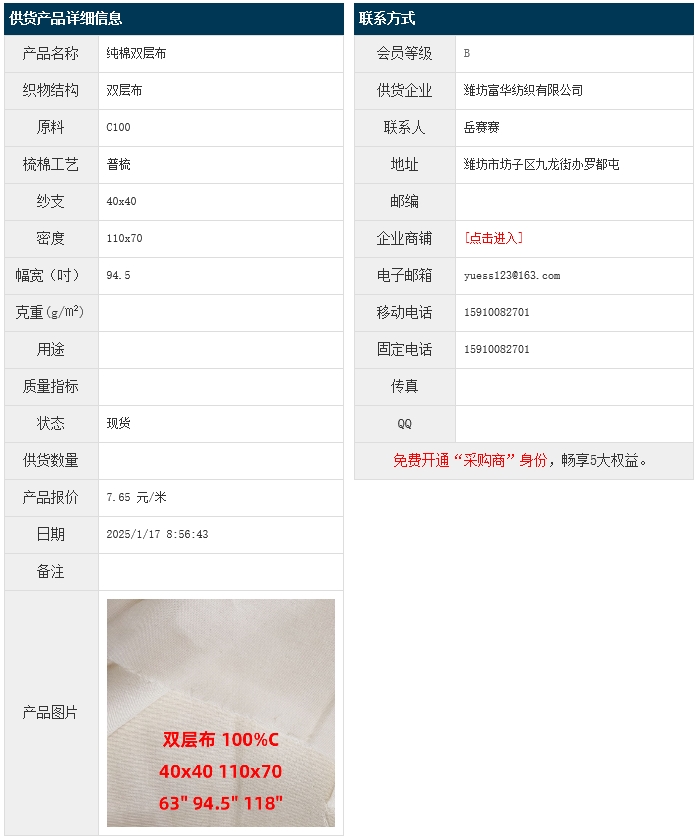 1月17日,濰坊富華紡織有限公司純棉雙層布C100 40x40 110x70 94.5",報價為7.65元/米,實際成交價以協(xié)商為準。[點擊查看詳情]