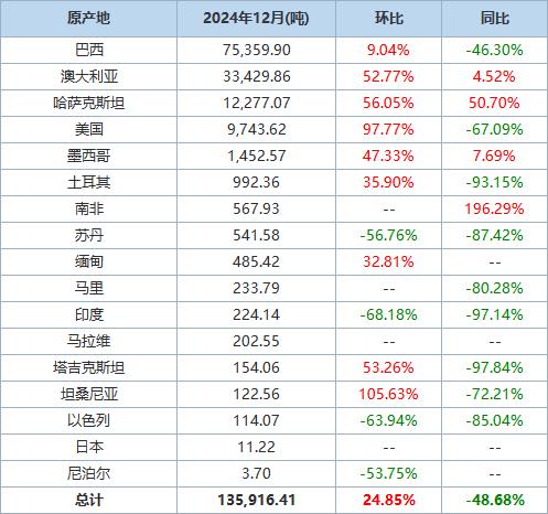 2024/25年度(2024.9-12)我國進口棉花約48萬噸,同比下降約56.4%。