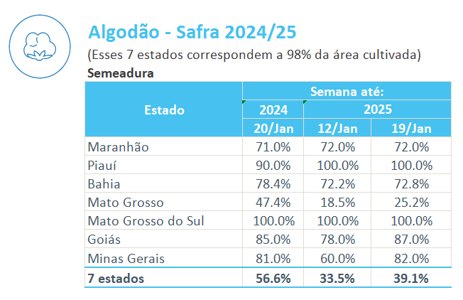 據巴西農業(yè)部下屬的國家商品供應公司CONAB,截至1月19日,巴西棉花播種率為39.1%,上周為33.5%,去年同期為56.6%。