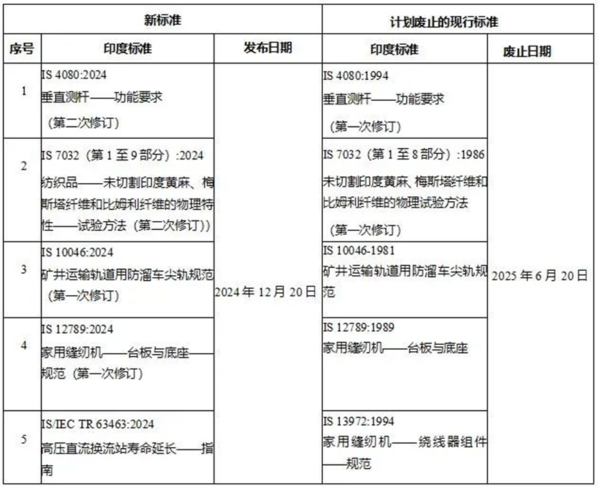 2025年1月3日,印度標準局(BIS)發(fā)布印度標準更新通知。該通知不僅確立5項新標準,還列出計劃廢止的5項相應現(xiàn)行標準。詳情見下表。