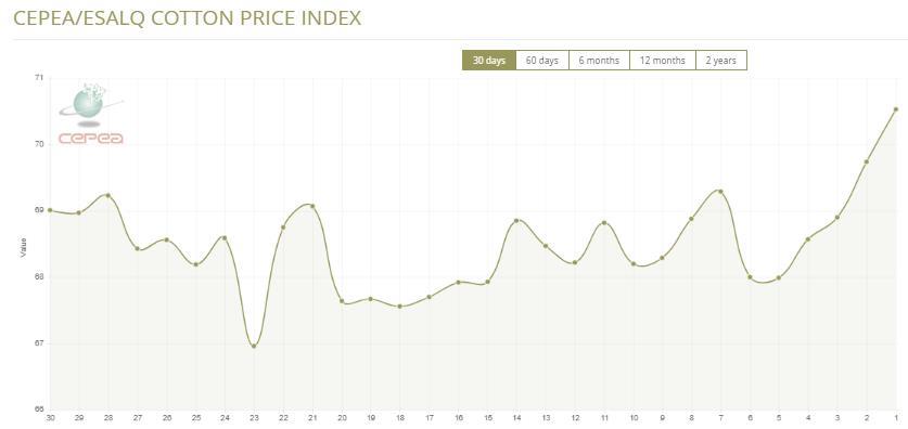 據(jù)外電1月23日消息,1月23日巴西CEPEA/ESALQ棉花價格指數(shù)報70.53美分/磅,較前一交易日上漲1.13%。